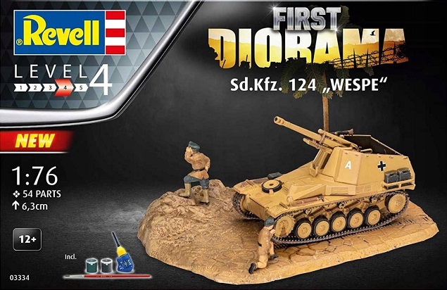 Balenie obsahuje model samohybnej húfnice Wespe s diorámou, lepidlo, farby, štetec
