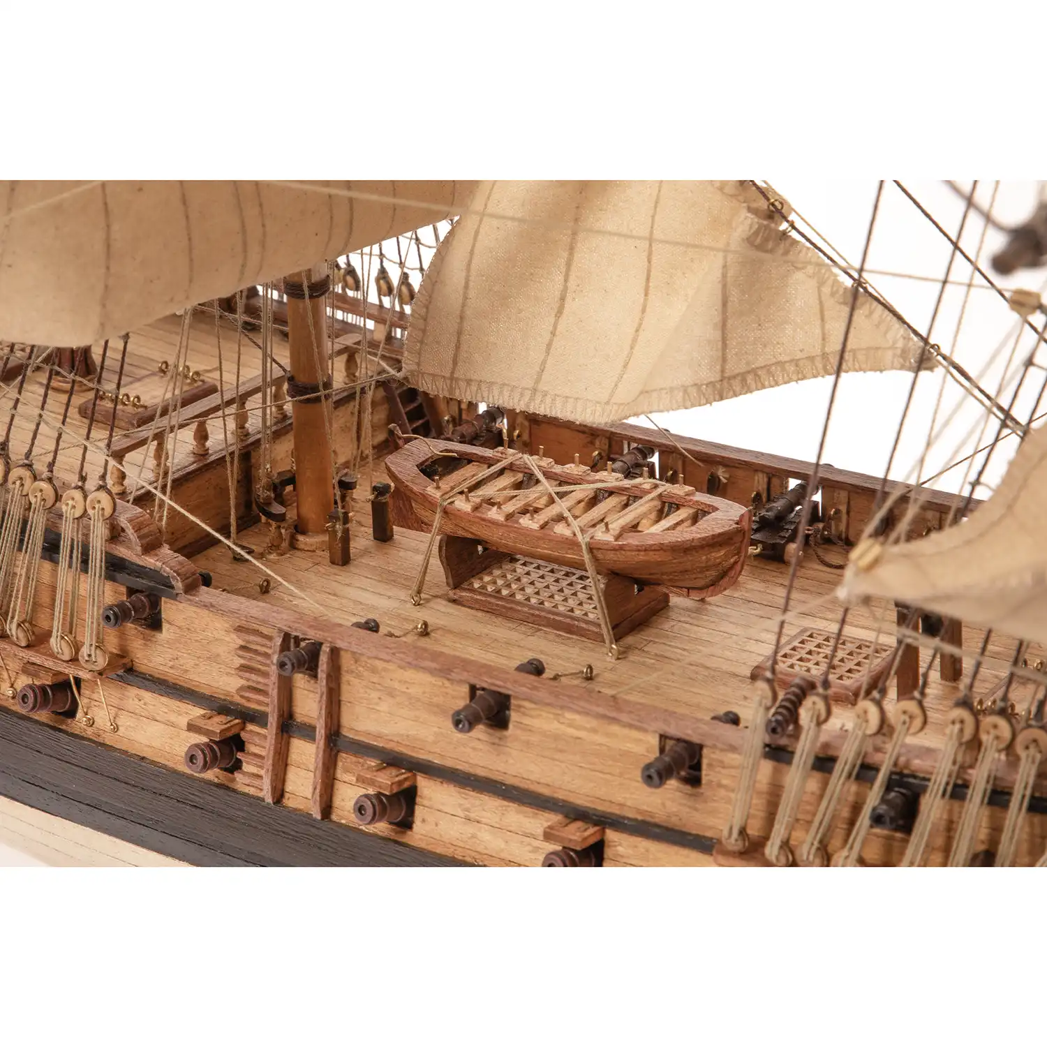 Stavebnica obsahuje laserom rezané diely, drevené lišty, kovové doplnky, takeláž a podrobný návod. Je ideálnym projektom pre skúsených modelárov, ktorí hľadajú výzvu a chcú vytvoriť reprezentatívny výstavný model.